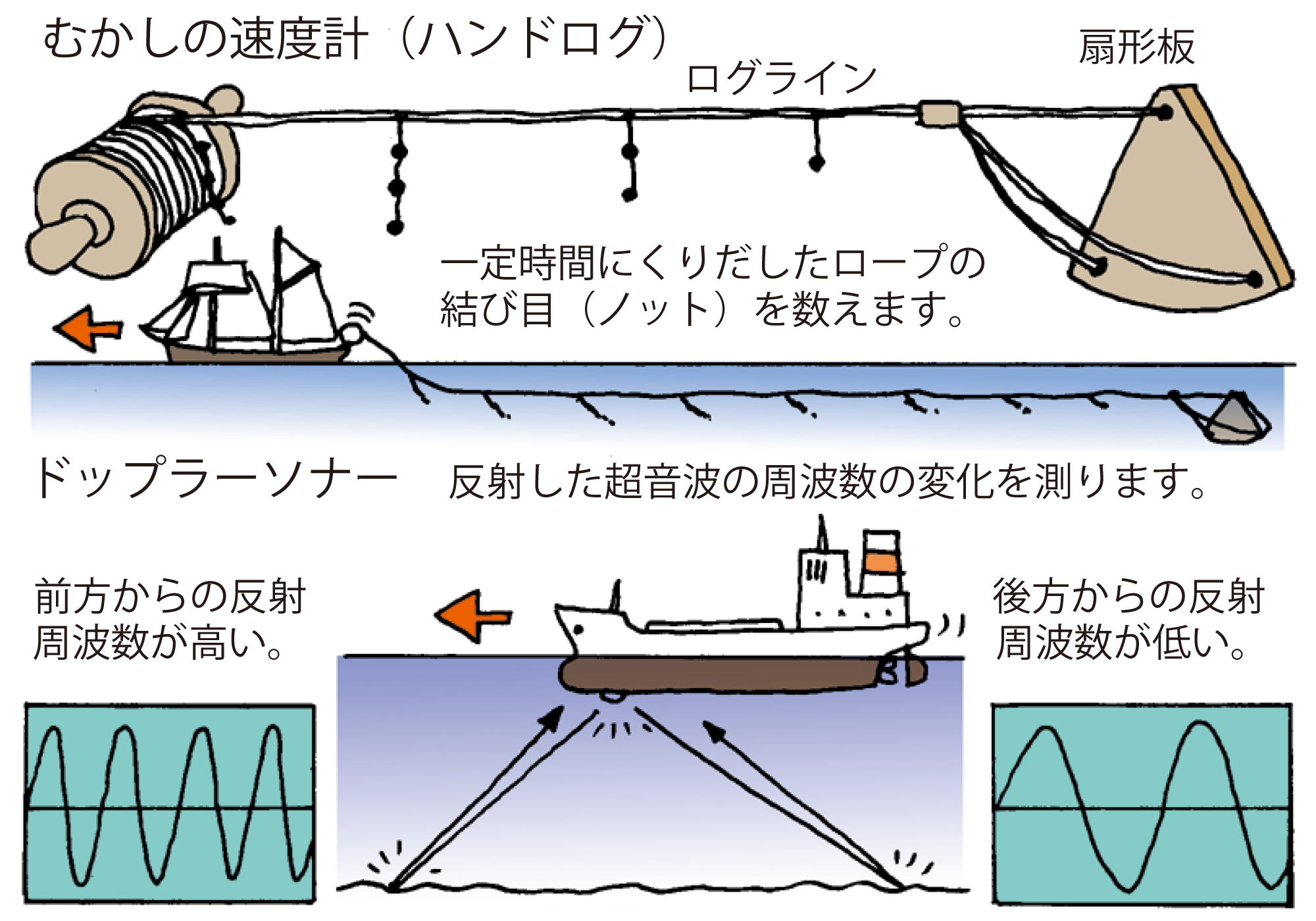 現代の船の速力は、いろいろな機械で測られています。電磁誘導をつかう電磁ログ、超音波を船底の装置から発射して、ふたたび船底にもどってきたときの音波の周波数の変化を計算して測るドップラーソナー、さらには人工衛星からの電波を利用して測るものなどです。
